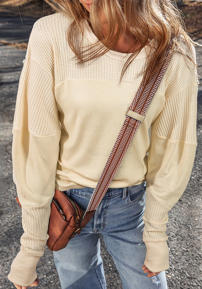 Beige Thermal Knit Patchwork Exposed Seam Long Sleeve Top