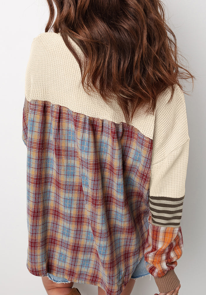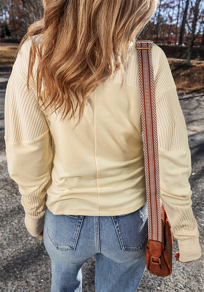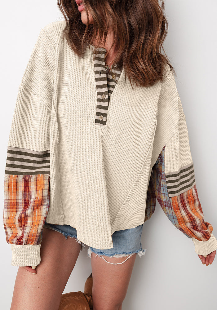 Beige Waffle Stripe Plaid Patchwork Henley Knit Top