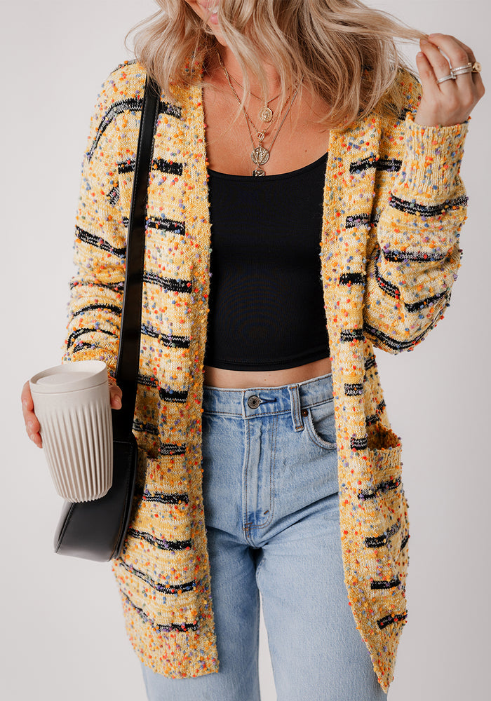 Beige Striped Pom Pom Knit Open Front Long Cardigan