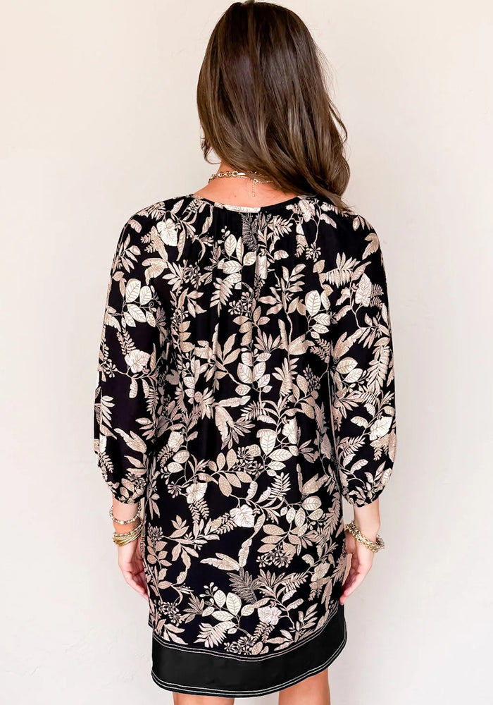 Black 3/4 Sleeve Botanical Print Split Neck Loose Mini Dress