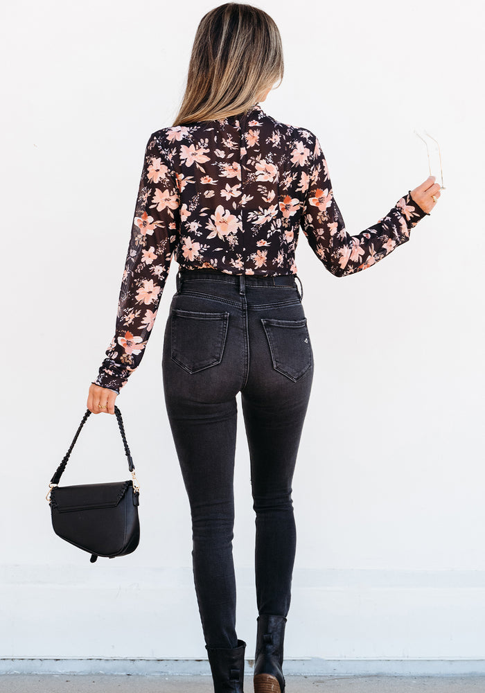 Black Floral Mesh Mock Neck Long Sleeve Slim Fit Top