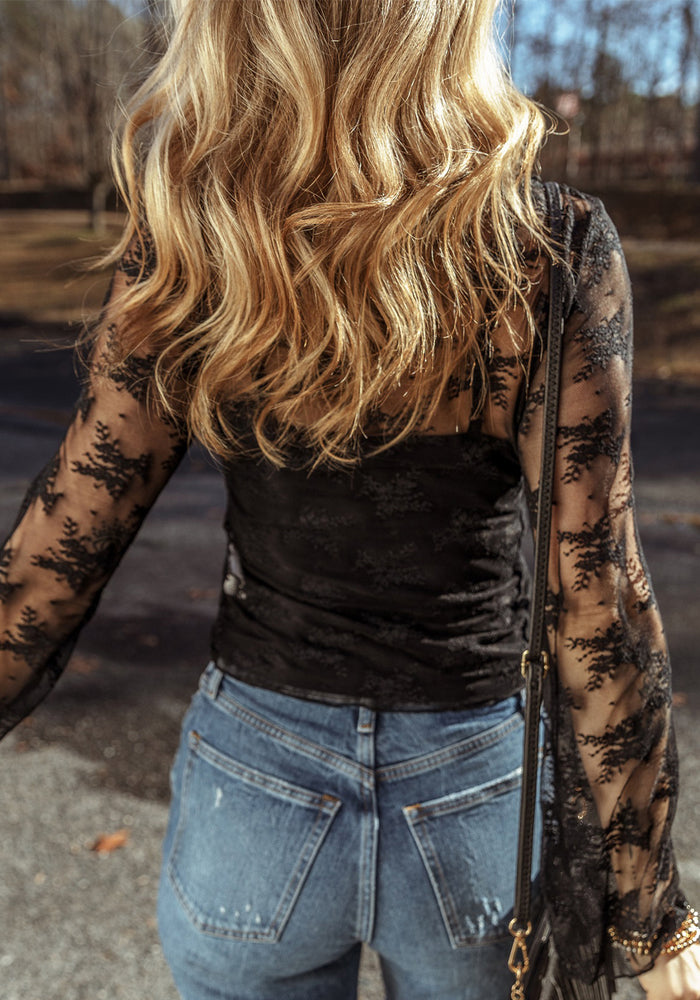 Black Lace Mesh Crochet Splicing Slim Fit Long Sleeve Blouse