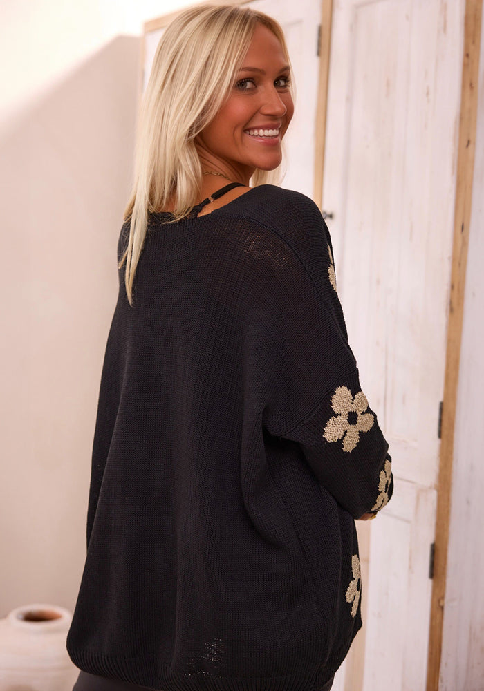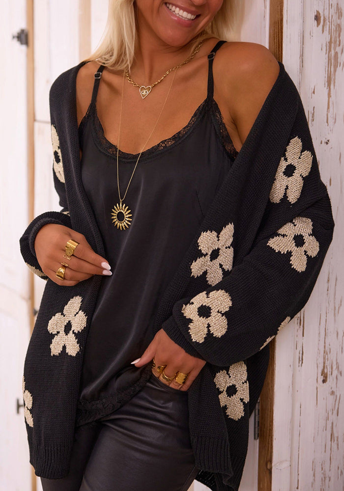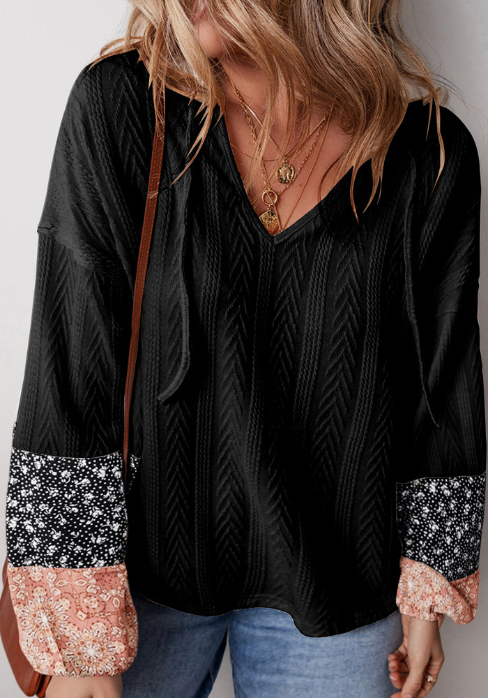 Black Floral Patchwork Textured Knit Drawstring V Neck Blouse