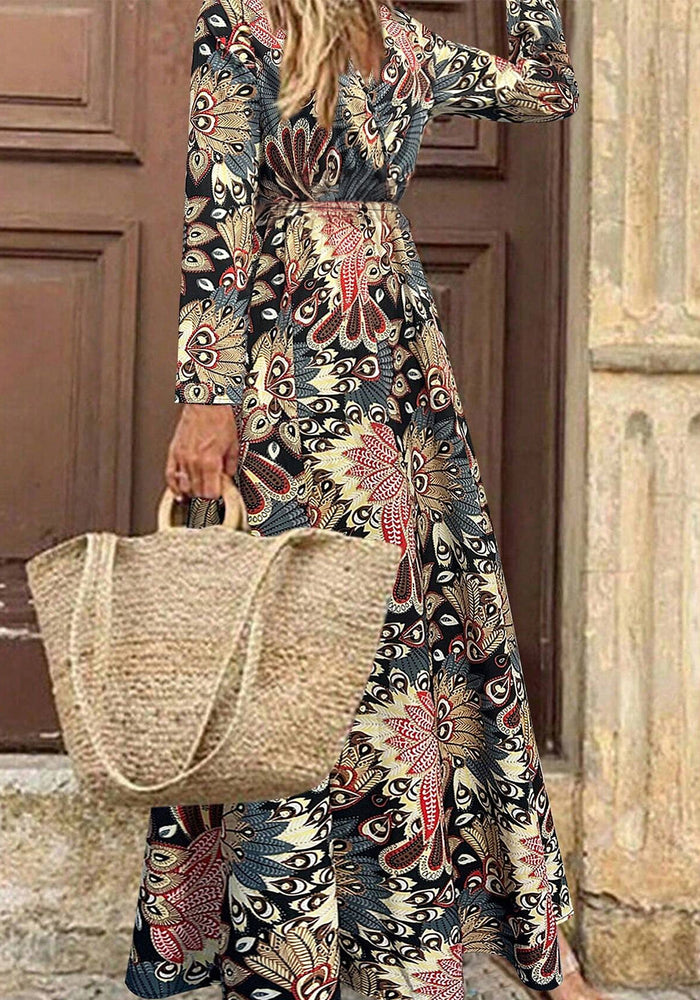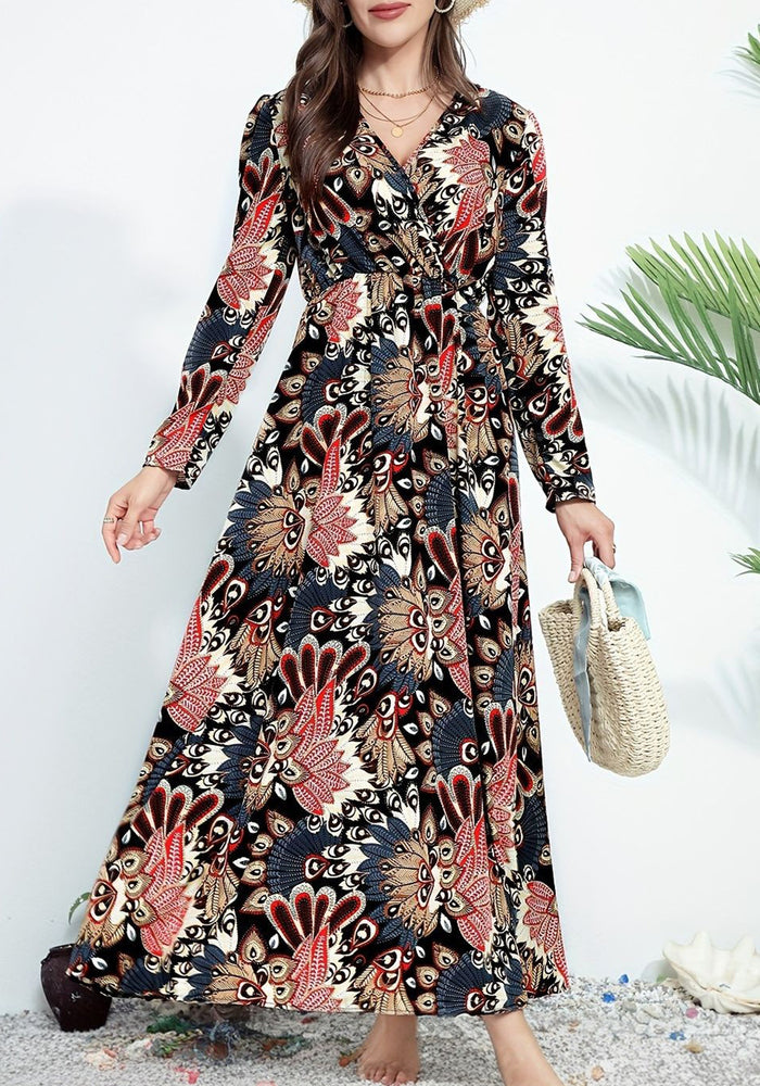 Black Floral Print V Neck Wrap High Waist Maxi Dress