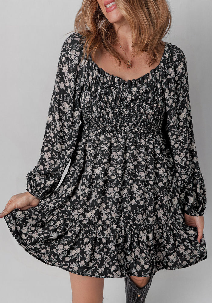 Black Floral Long Sleeve Frilly Shirred Square Neck Mini Dress