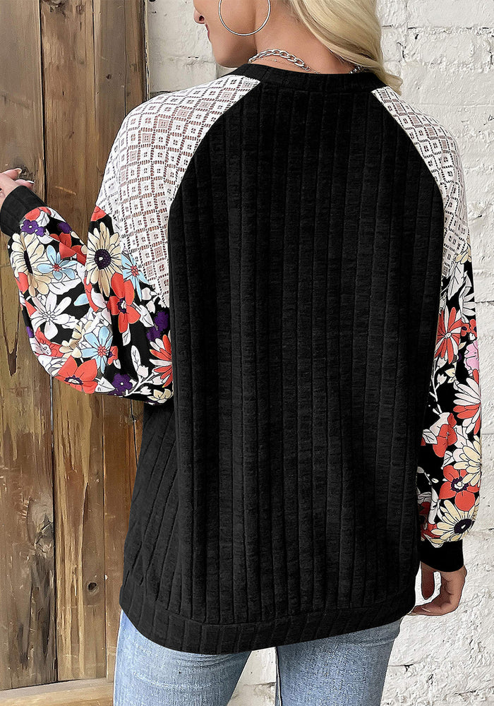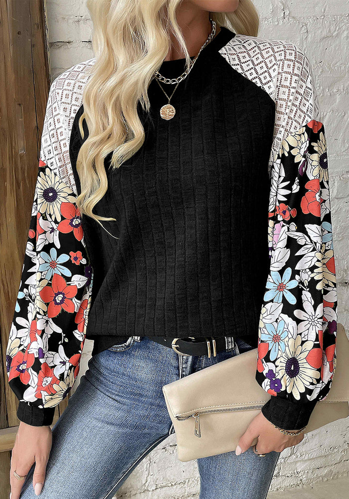 Black Floral Patchwork Long Sleeve Ribbed Blouse