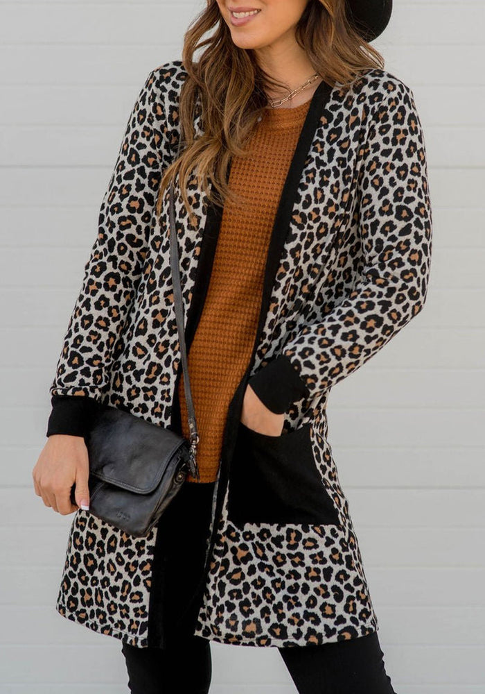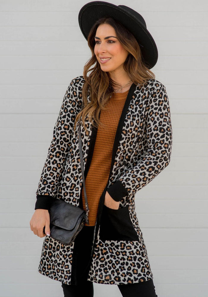 Black Leopard Patched Pocket Open Front Cardigan