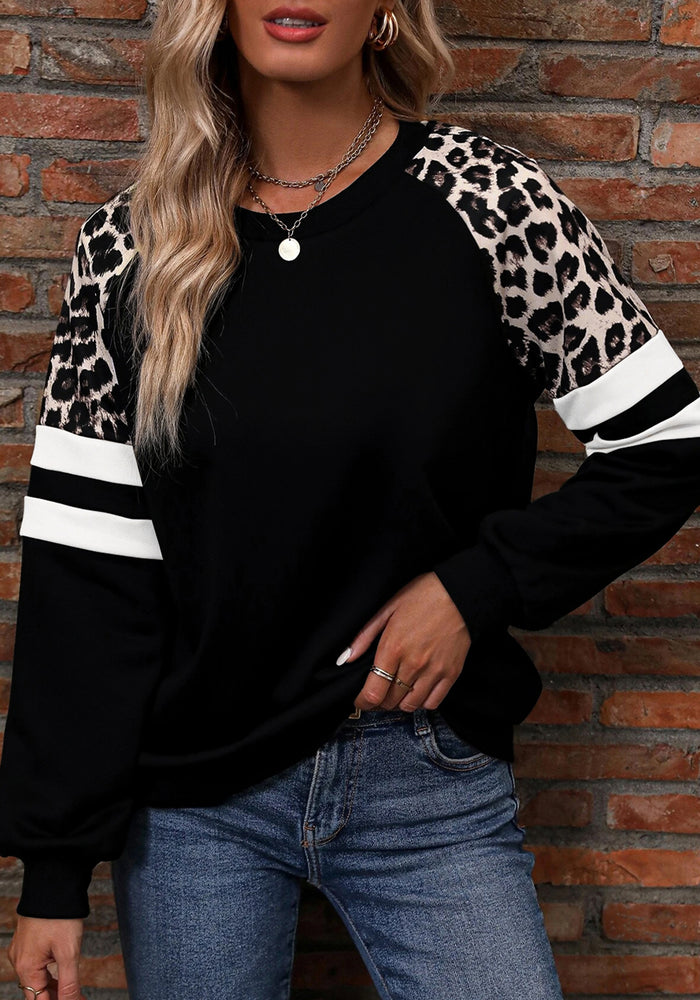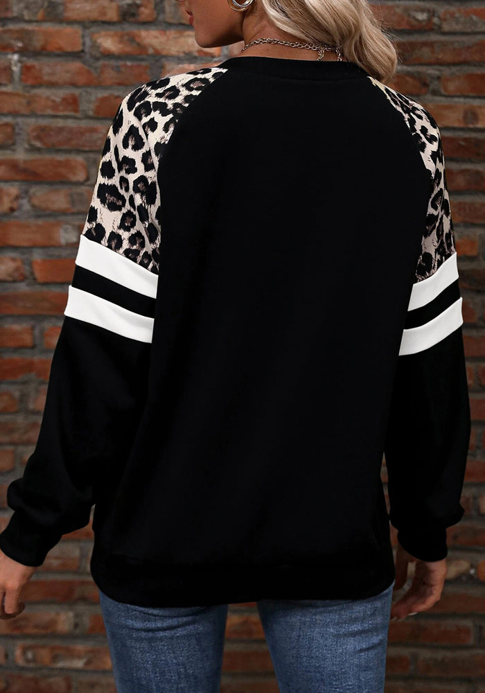 Black Leopard Print Colorblock Raglan Sleeve Sweatshirt