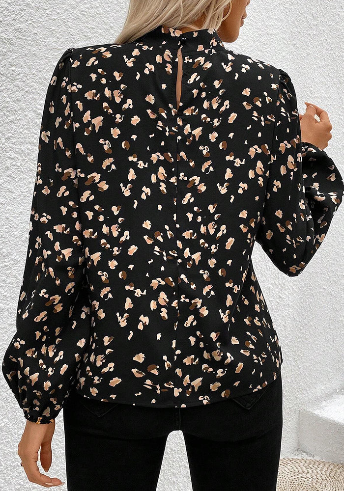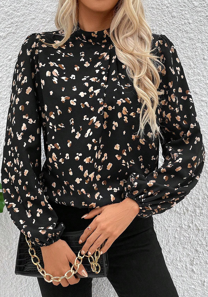 Black Leopard Print Lantern Sleeve Mock Neck Pleated Blouse