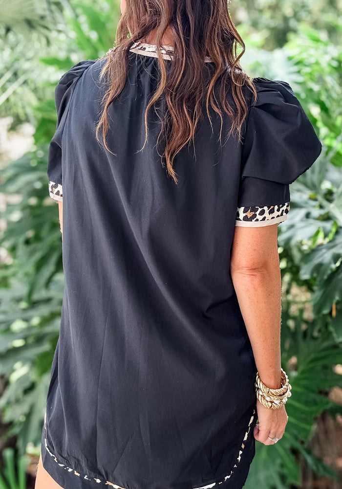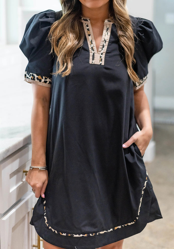 Black Leopard Trim Notched Neck Short Puff Sleeve Shift Mini Dress