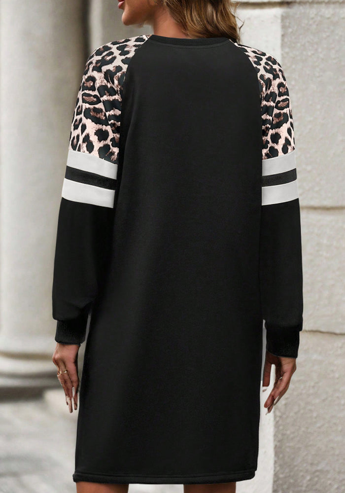 Black Leopard Print Patchwork Varsity Raglan Sleeve Sweatshirt Dress