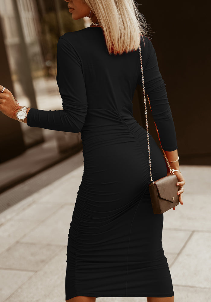 Black Long Sleeves Wrap V Neck Ruched Sheath Midi Dress