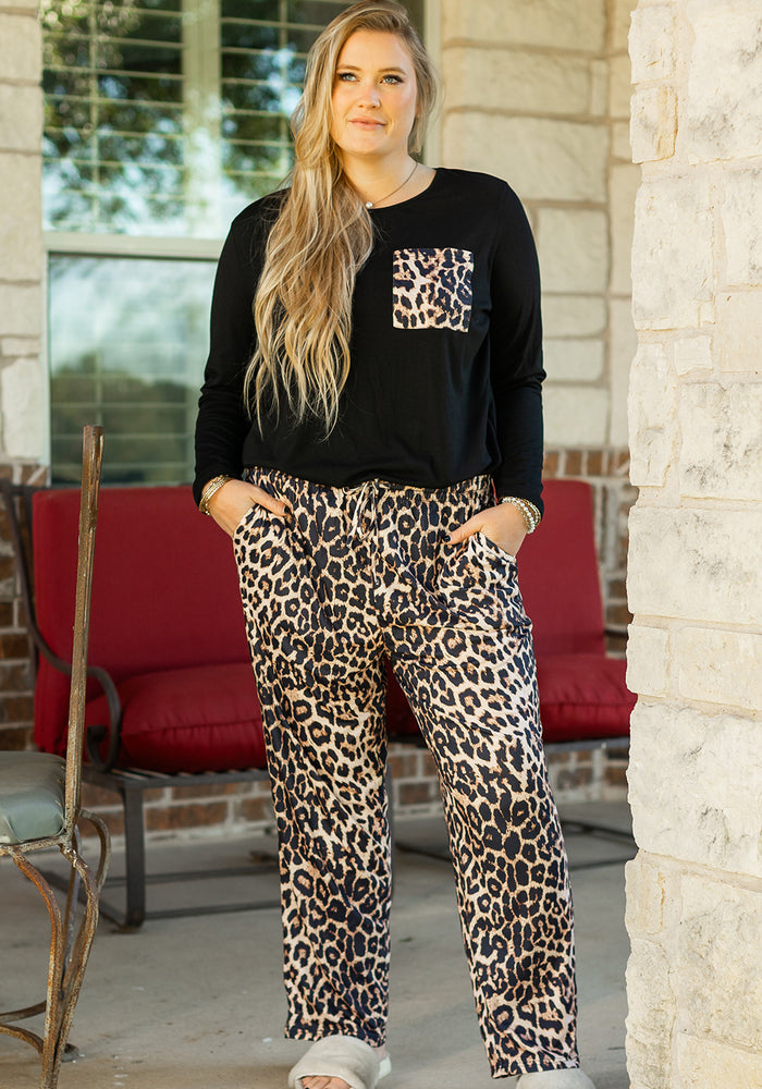 Black Leopard Patched Pocket Long Sleeve Top Plus Size Pants Set