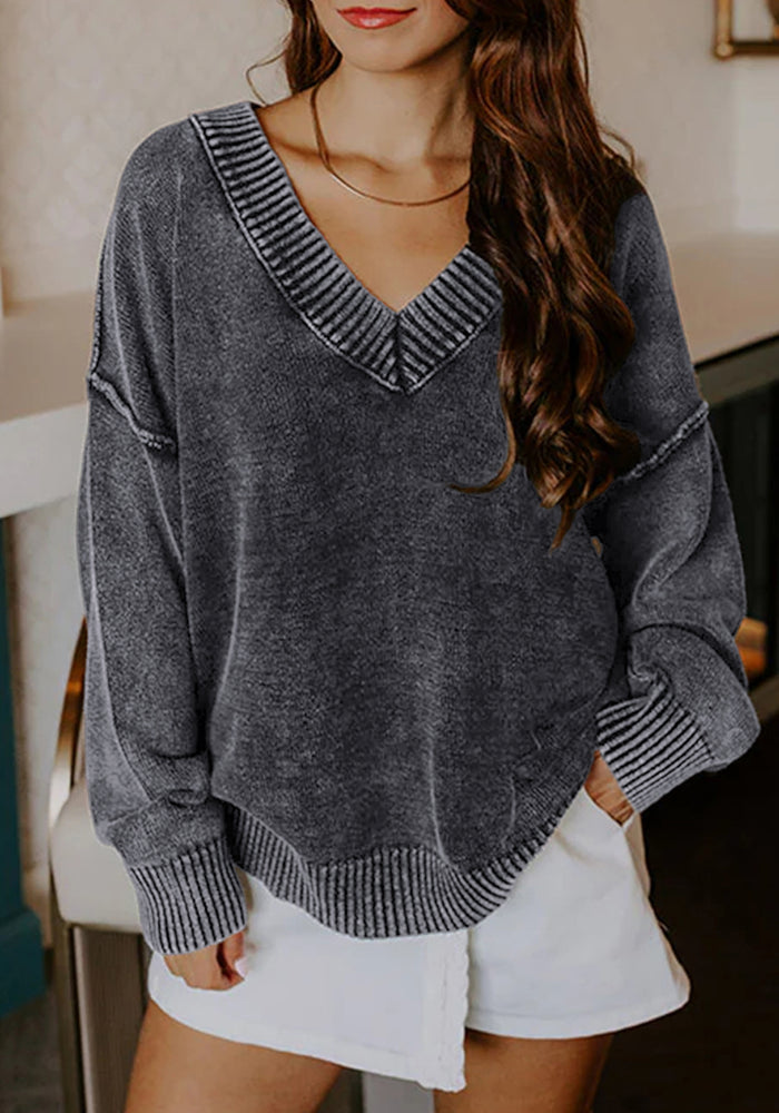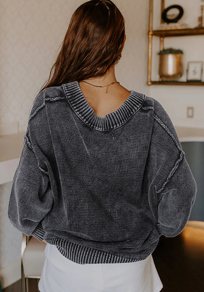Black Mineral Wash V Neck Knit Exposed Seam Drop Shoulder Loose Sweater