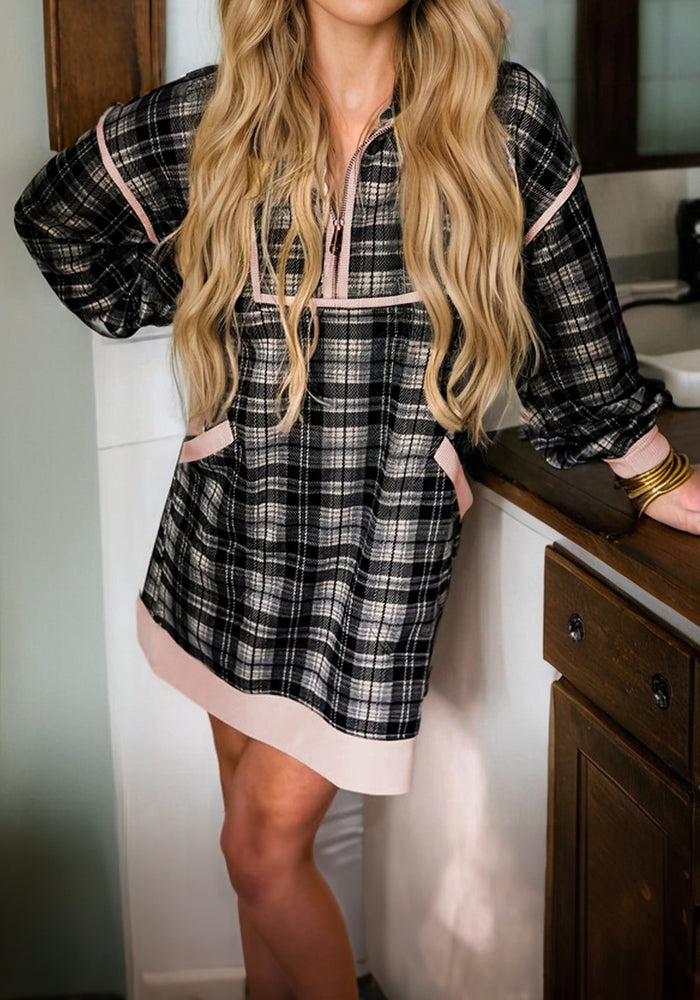 Black Plaid Polo Collar Zip up Contrast Trim Shift Long Sleeve Mini Dress