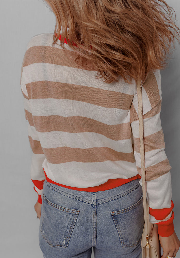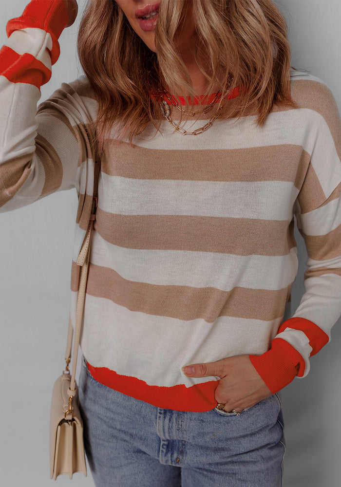 Apricot Colorblock Striped Round Neck Drop Shoulder Sweater