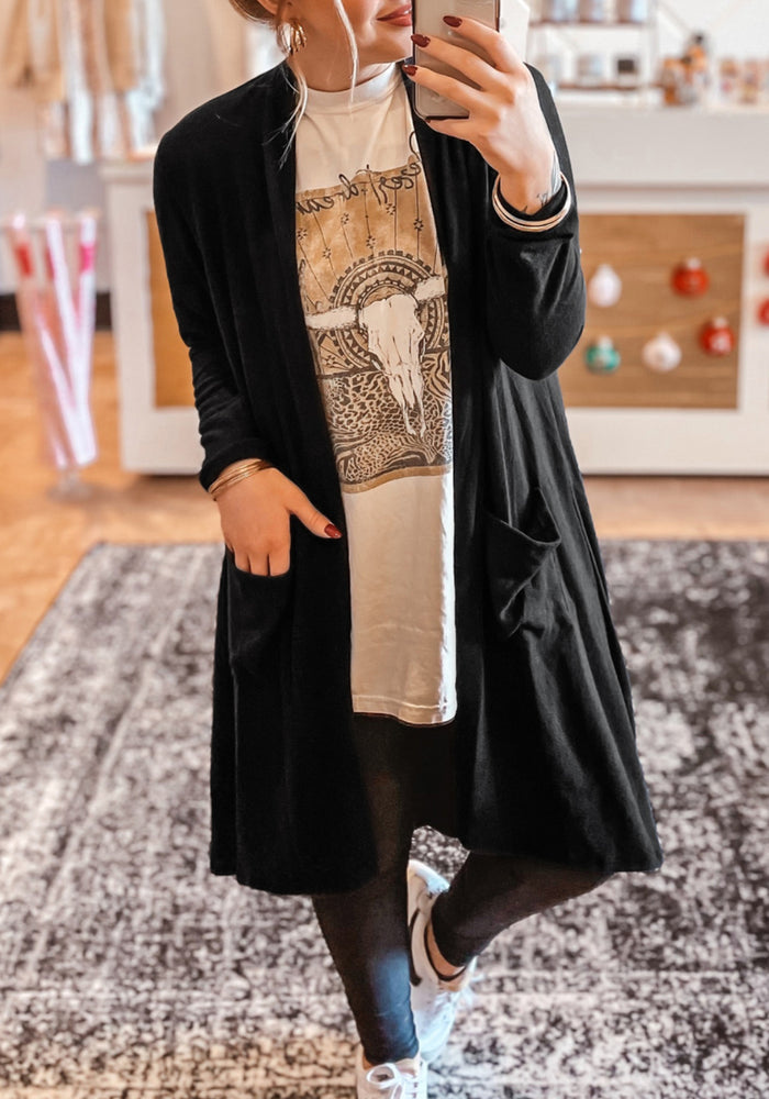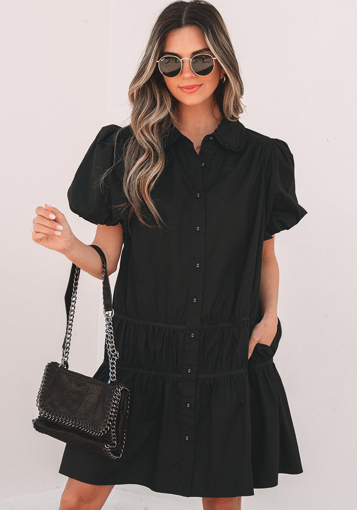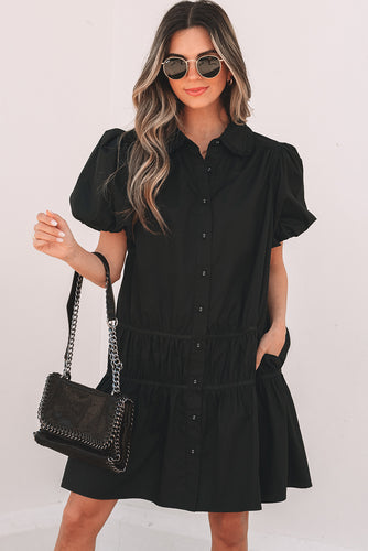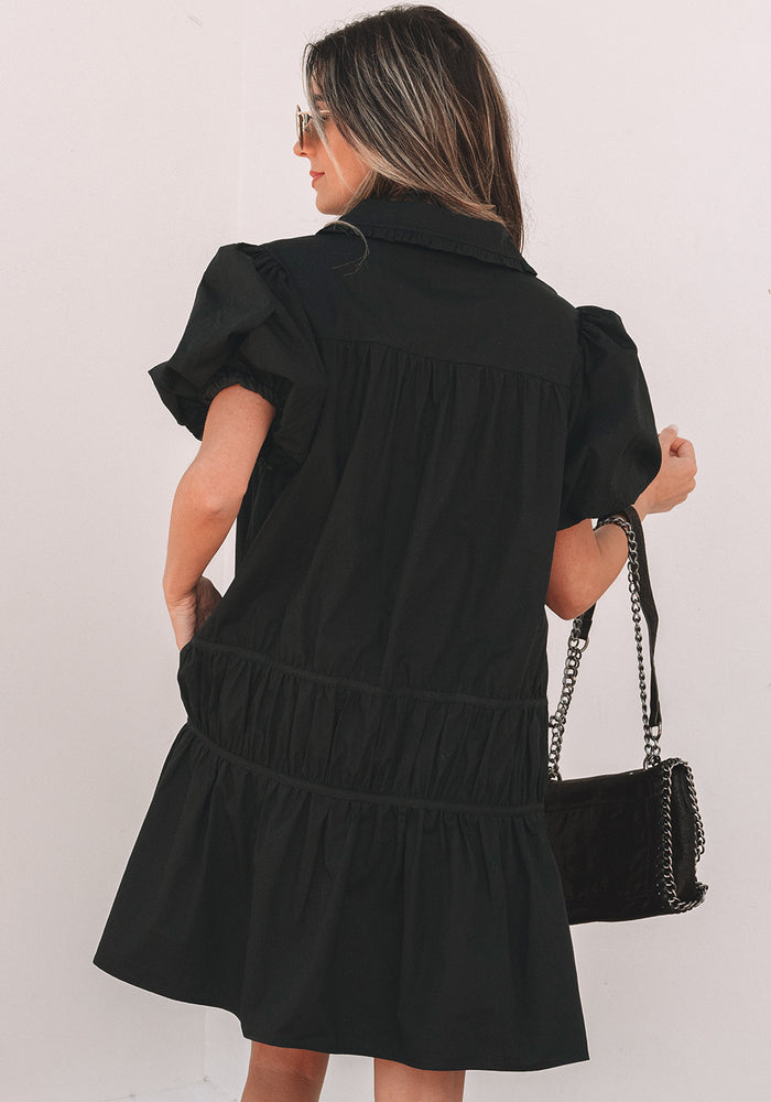 Black Shirt Style Button Down Puff Sleeve Ruffle Hem Dress