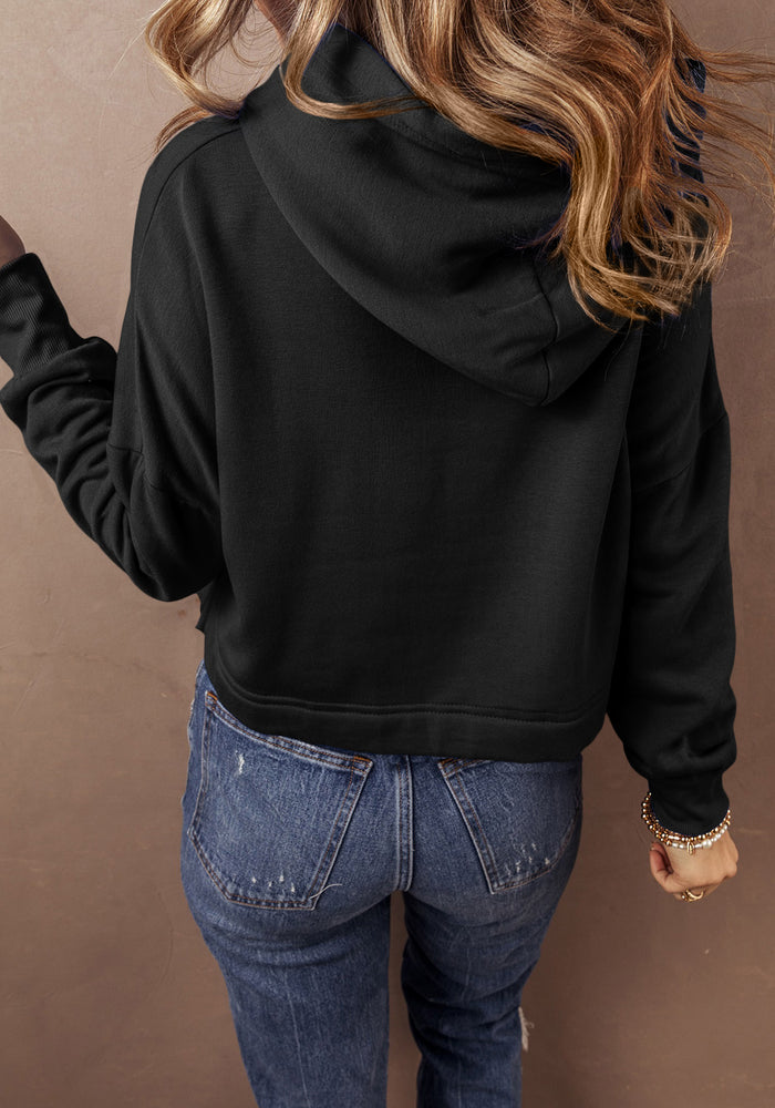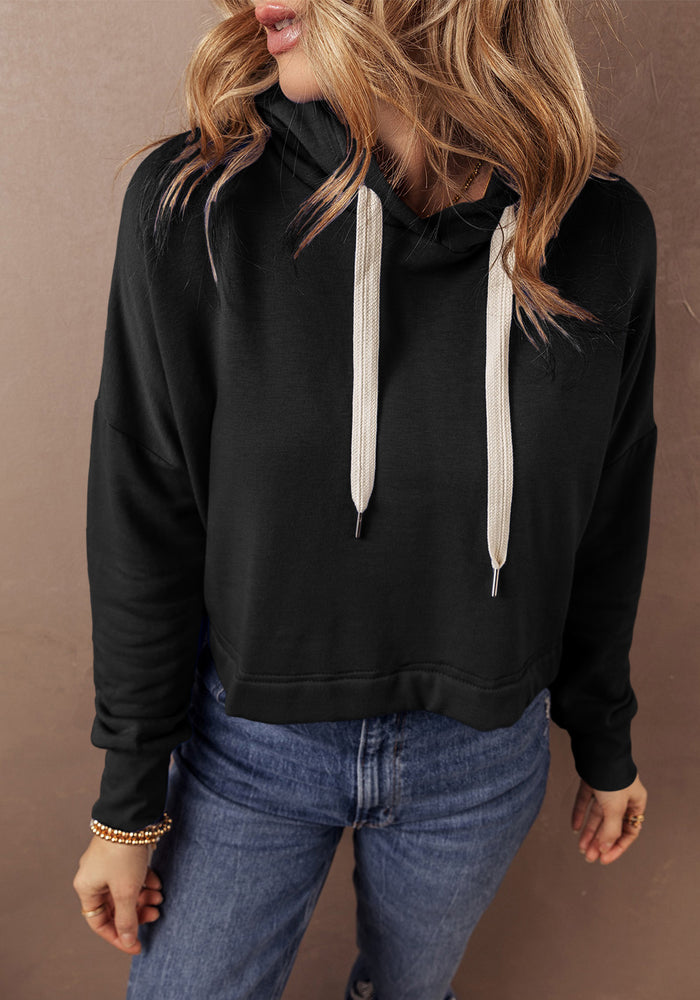 Black Solid Drop Shoulder Drawstring Cropped Hoodie