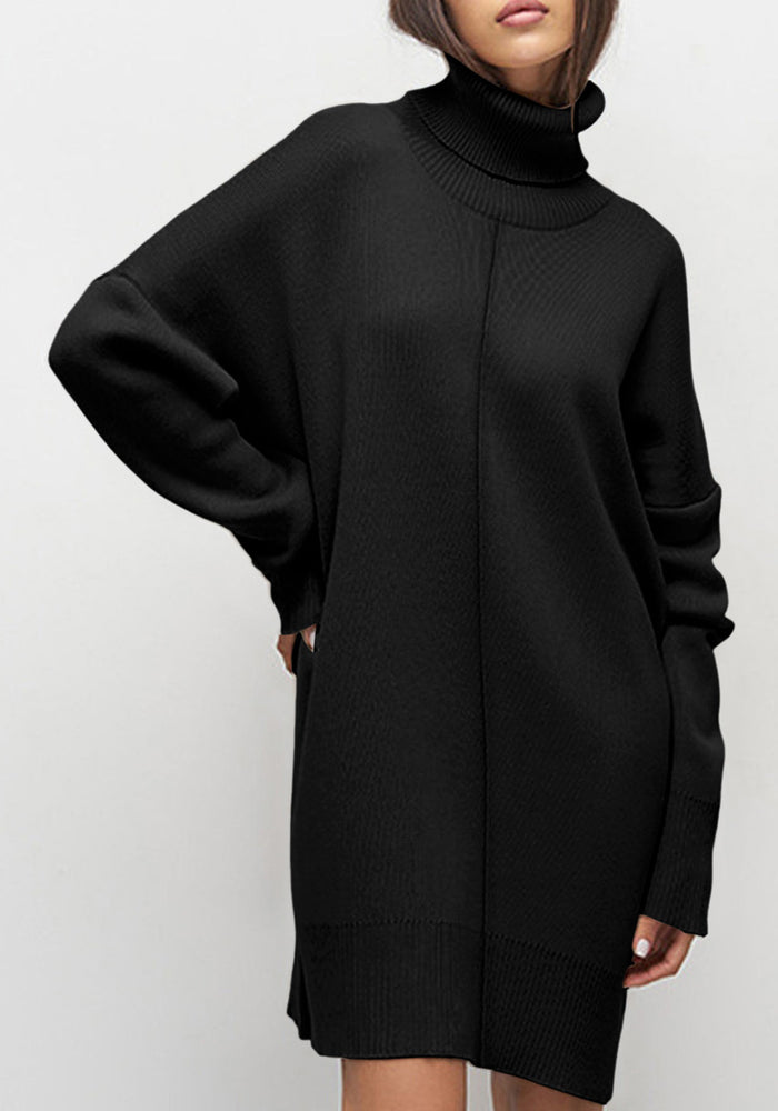 Black Solid Color Turtleneck Drop Shoulder Loose Sweater Dress