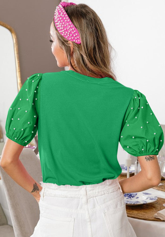 Bright Green Ribbed Pearl Beaded Puff Sleeve Top