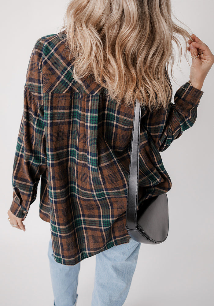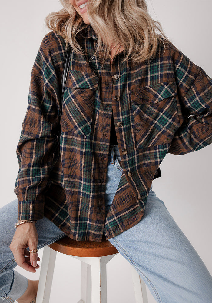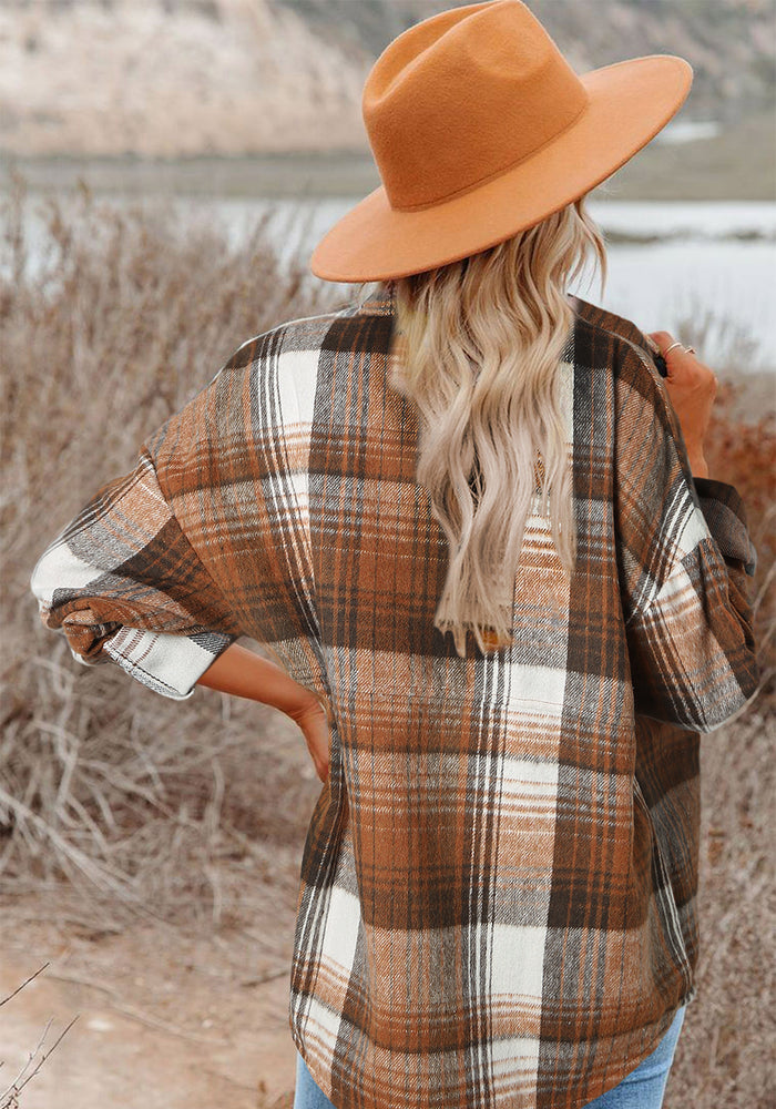 Brown Plaid Print Chest Pockets Buttoned Shirt Jacket