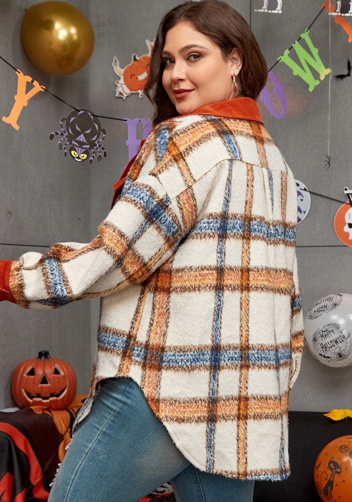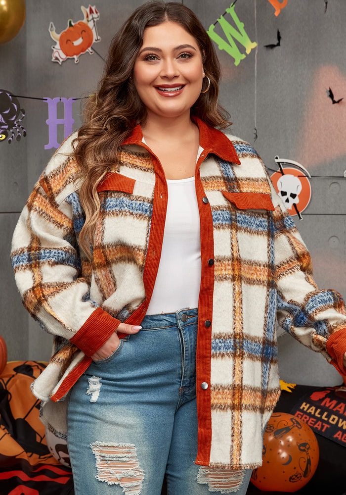 Brown Stripe Plus Size Plaid Print Collared Buttoned Jacket