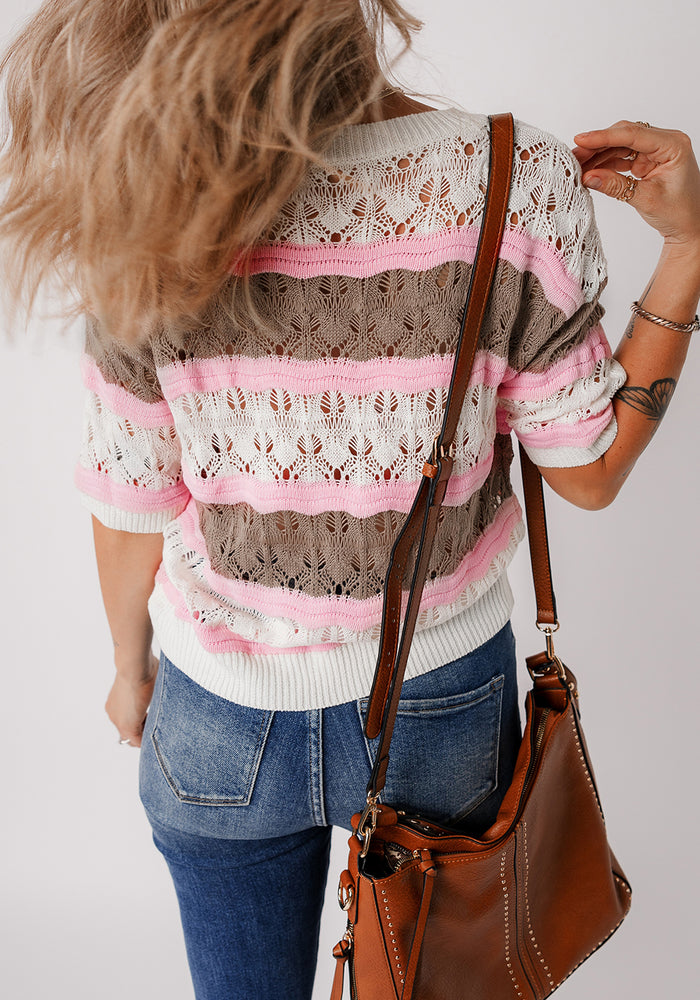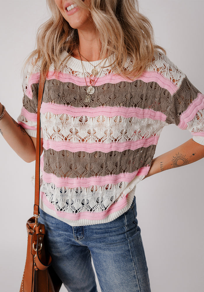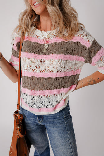 Brown Stripe Color Block Hollow Out Crochet Half Sleeve Sweater