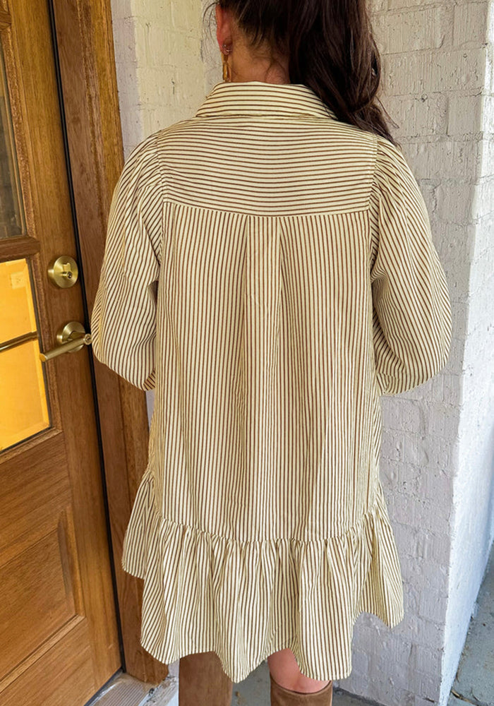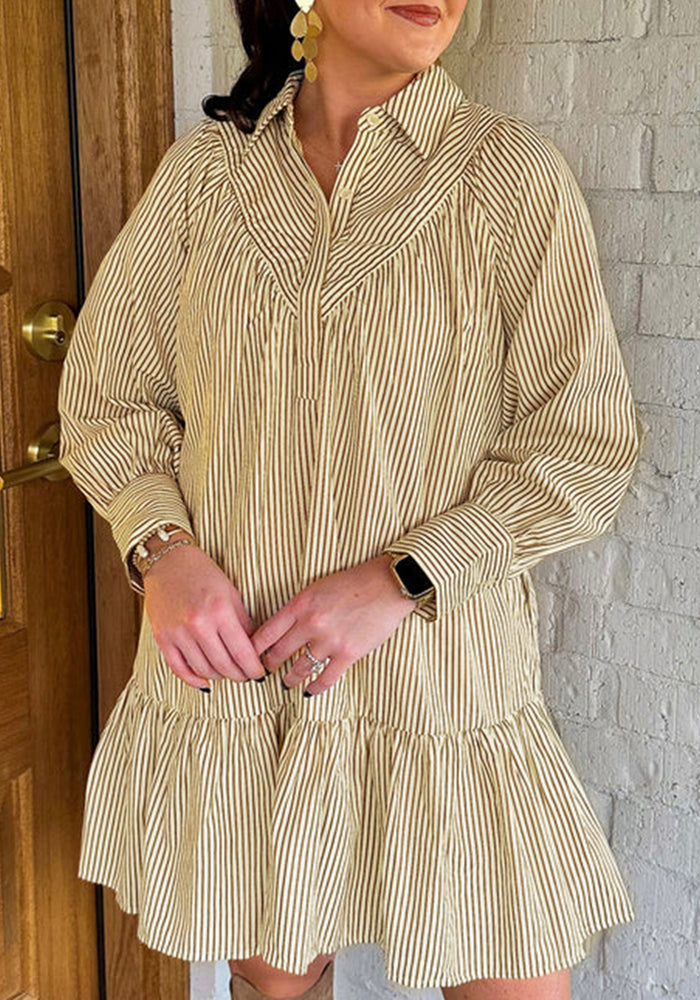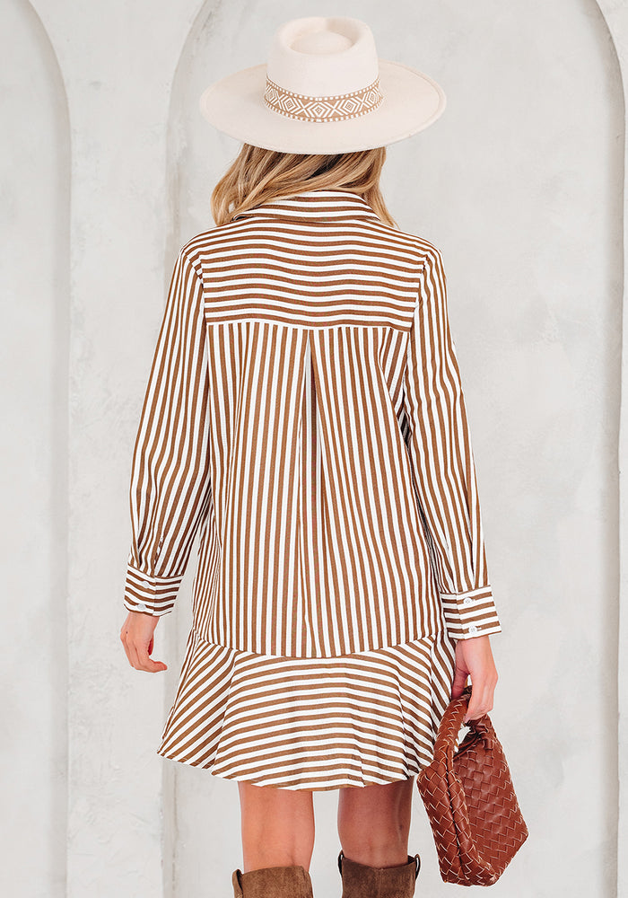 Brown Stripe Ruffled Hem Collared Long Sleeve Shirt Mini Dress