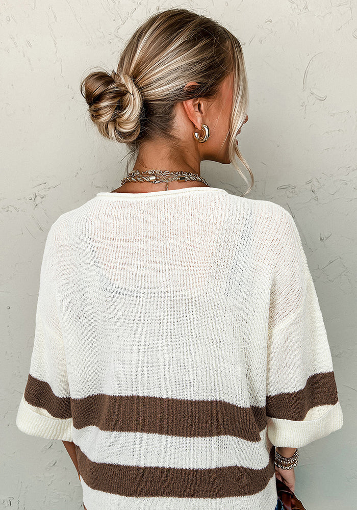 Brown Stripe Ribbed Henley Drop Shoulder Slouchy Sweater