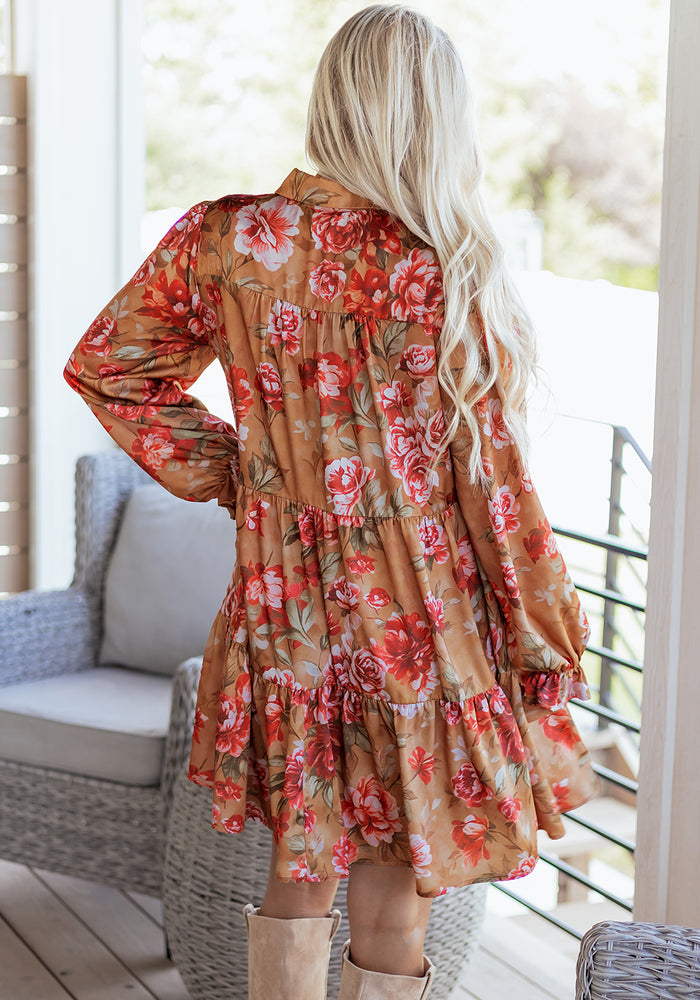 Brown Vintage Floral Print Shirt Style Half Button Long Sleeve Ruffle Mini Dress