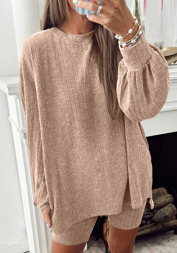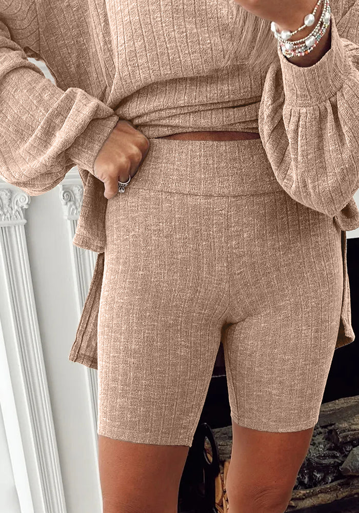 Dark Khaki Ribbed Balloon Sleeve Pullover Top and Biker Knitted Short Set
