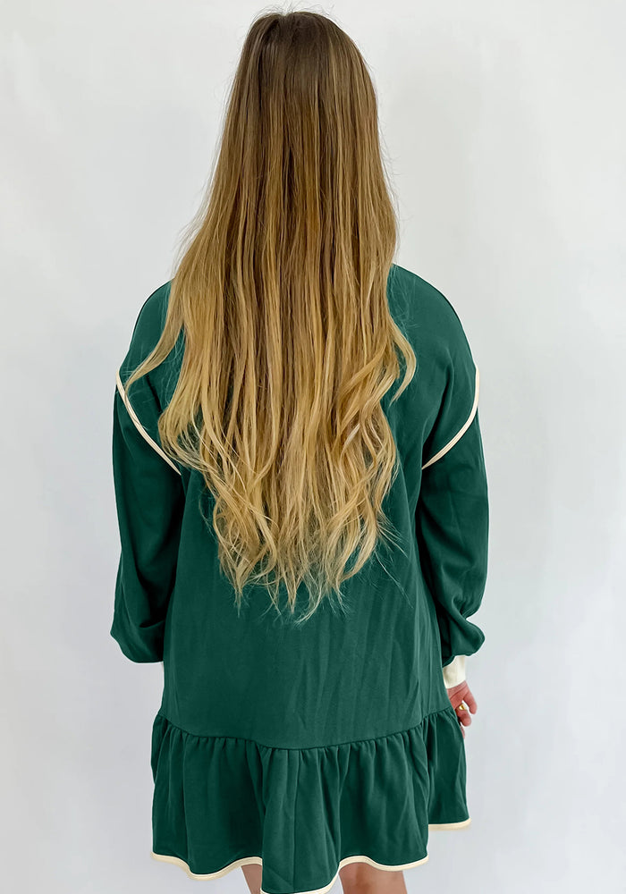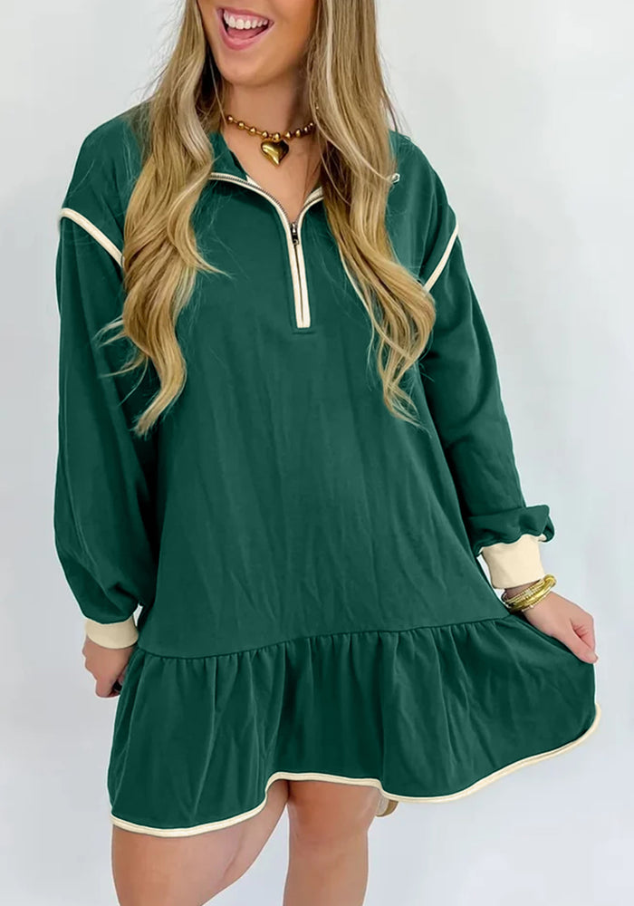 Evergreen Contrast Trim Zip Collar Long Sleeve Ruffle Hem Mini Dress
