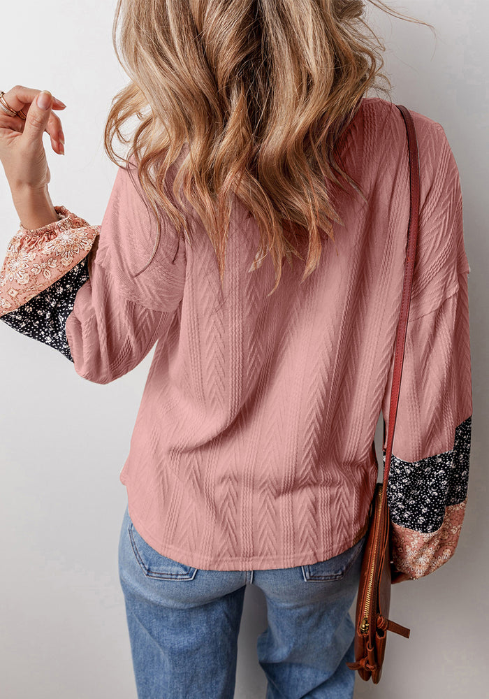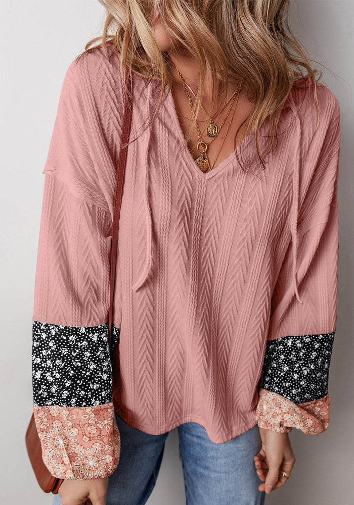 Dusty Pink Floral Patchwork Textured Knit Drawstring V Neck Blouse