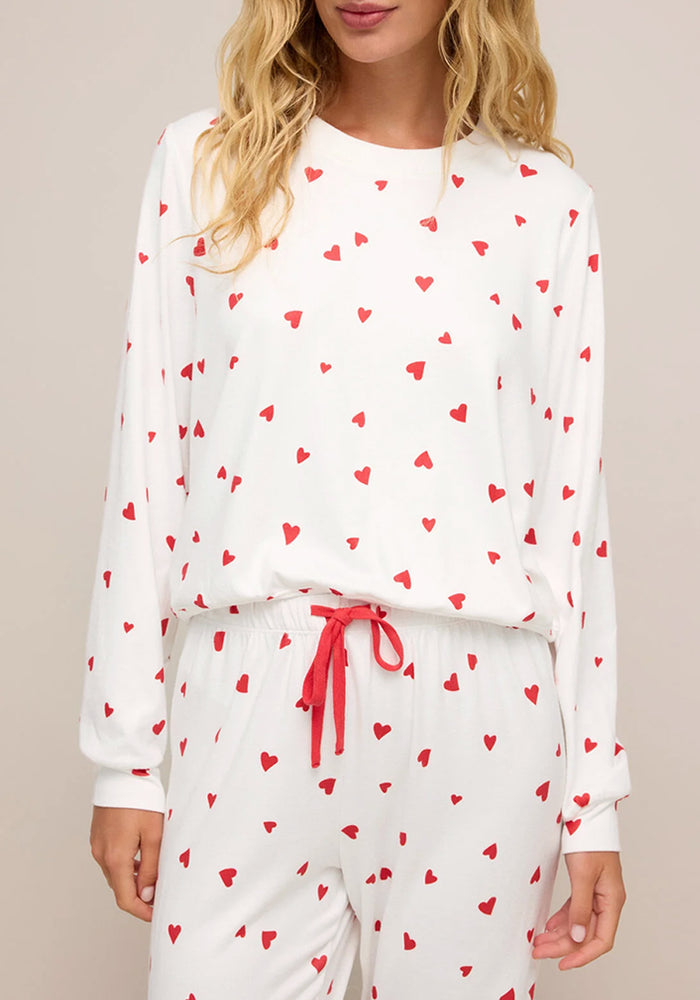 Fiery Red Tiny Hearts Printed Long Sleeve Top Drawstring Lounge Pant Set