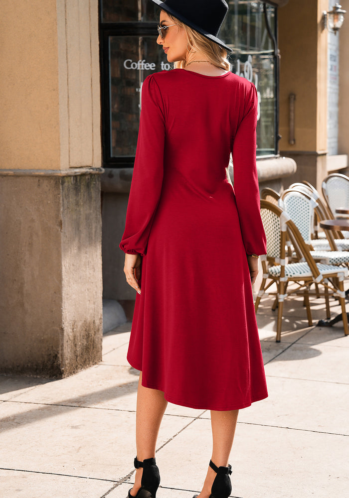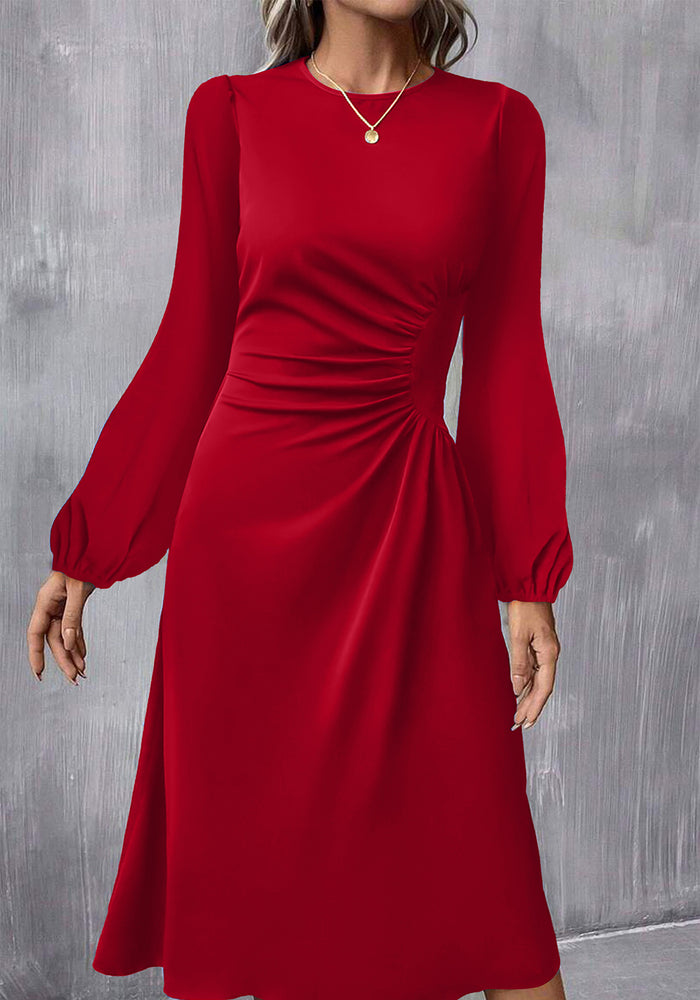 Fiery Red Solid Color Ruched Detail Long Sleeve Midi Dress