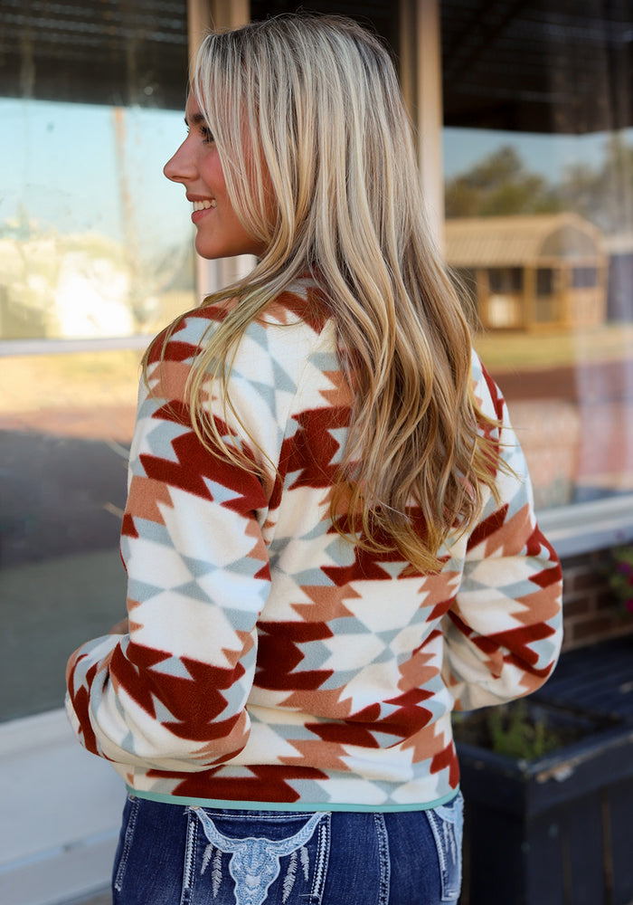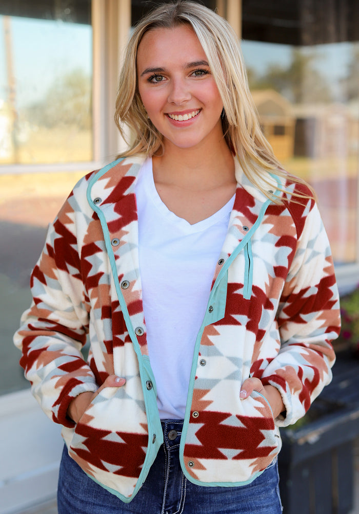 Fiery Red Western Aztec Buttoned Zipper Pockets Fleece Jacket