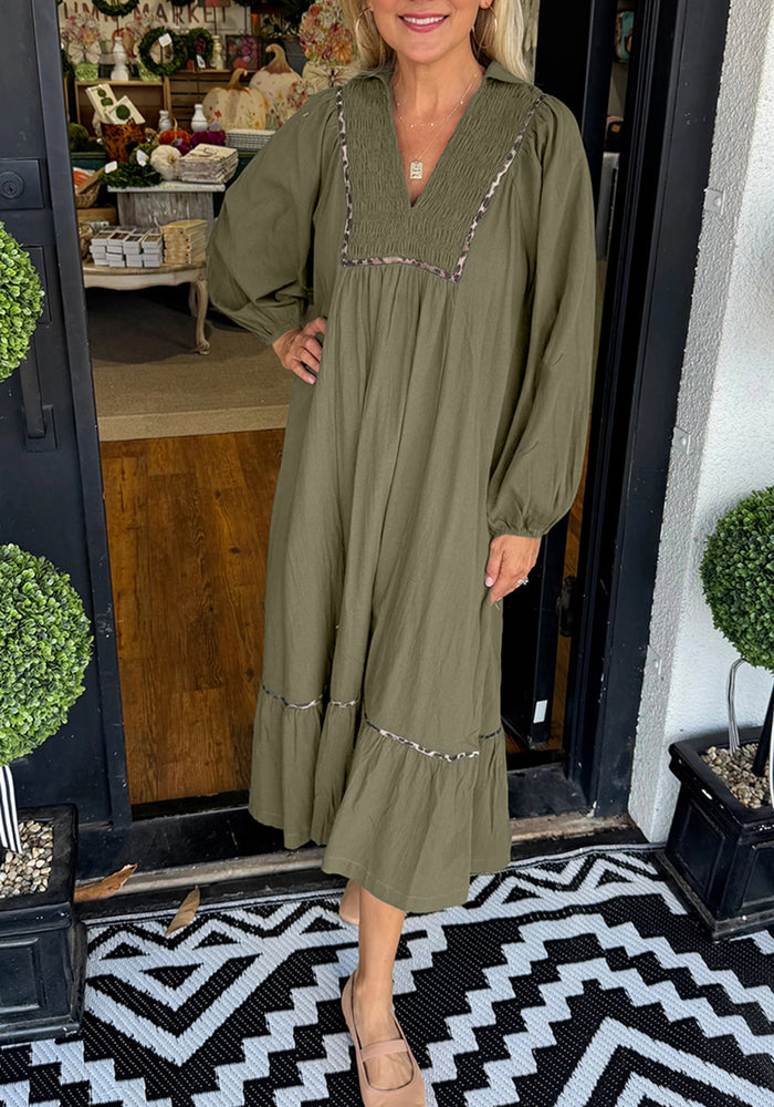 Four Leaf Clover Collared V Neck Smocked Detail Contrast Leopard Trim Bracelet Sleeve Long Dress