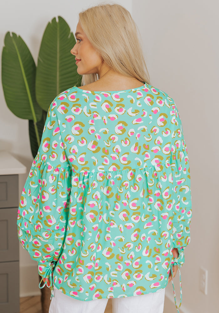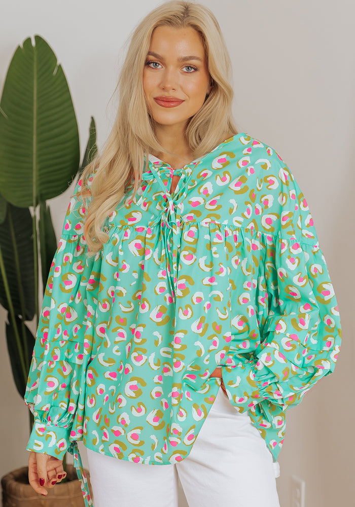Green Abstract Printed Lace-up Lantern Sleeve Babydoll Blouse