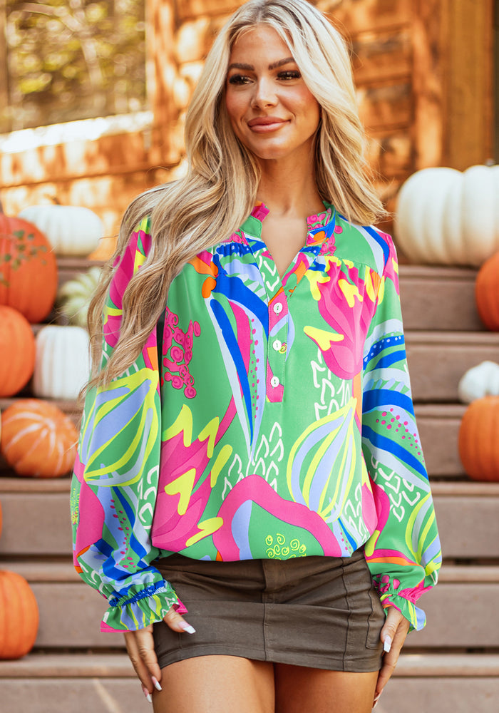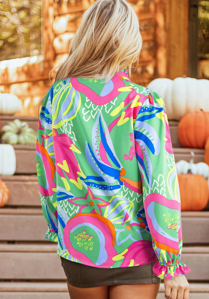 Green Abstract Print Ruffled Sleeve Buttoned V Neck Blouse