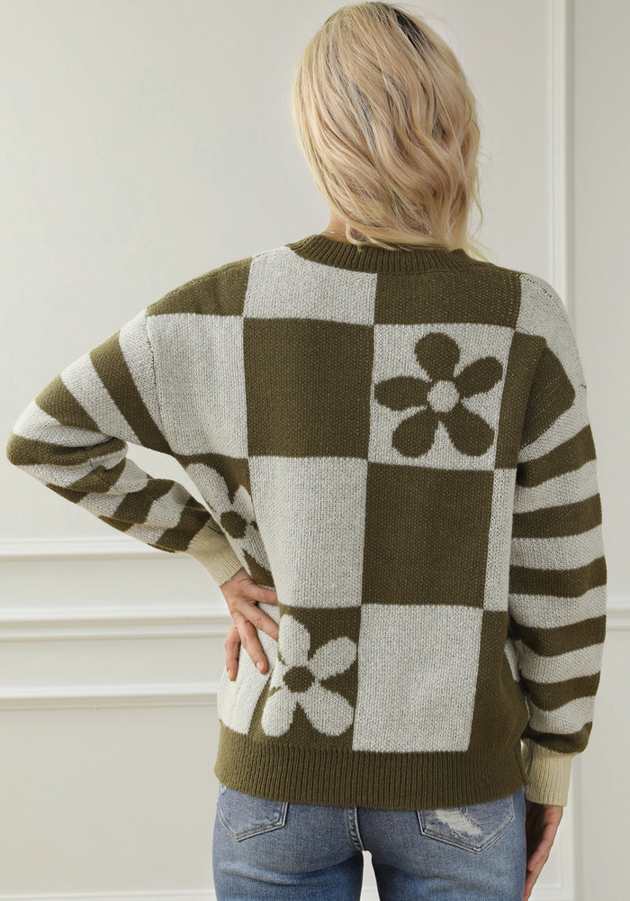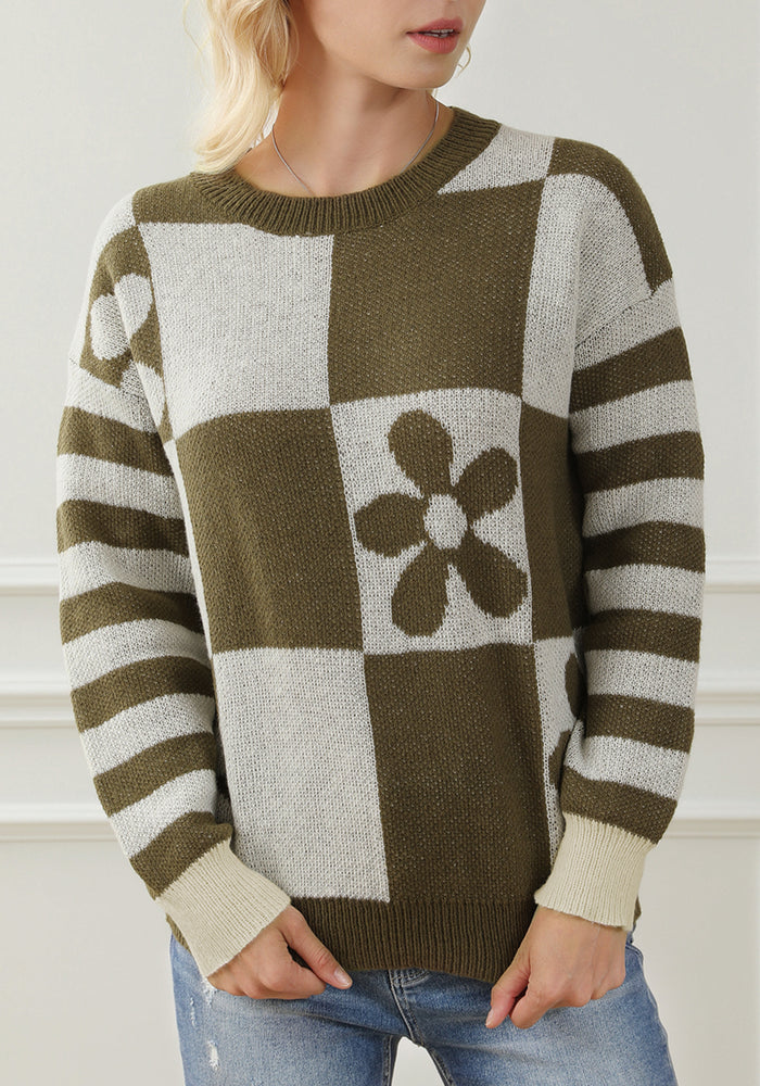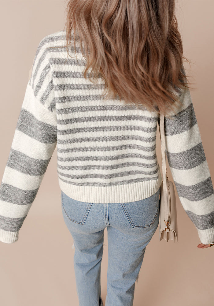 Gray Stripe Drop Shoulder Crew Neck Sweater