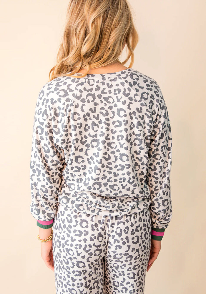 Gray V Neck Leopard Long Sleeve Top Striped Webbing Patchwork Drawstring Pant Set