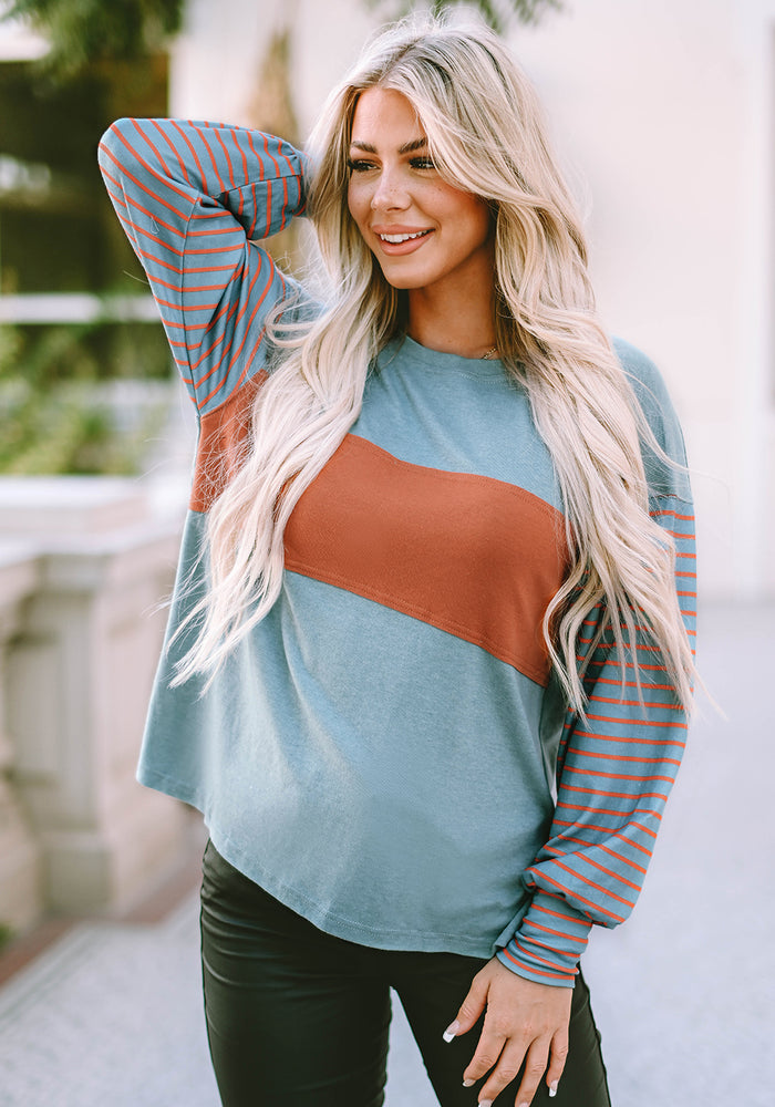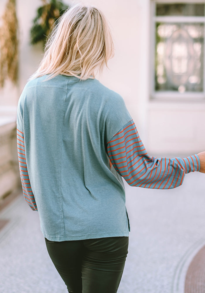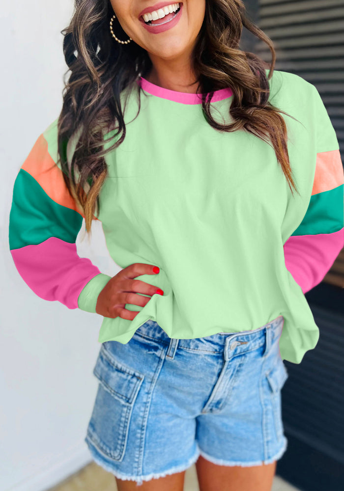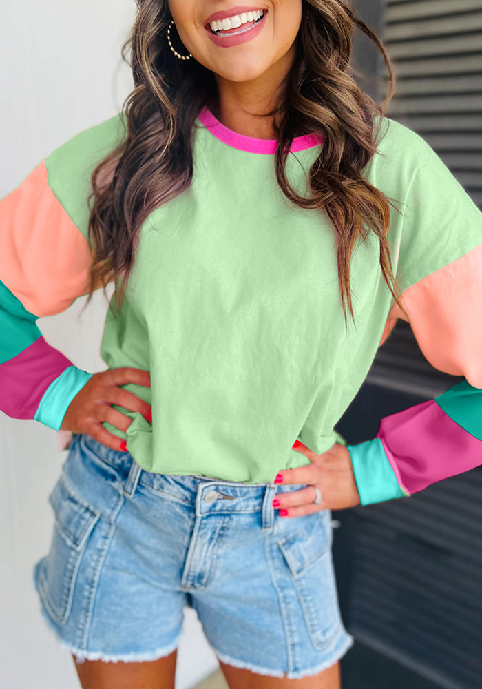 Green Colorblock Patchwork Long Sleeve Loose Top