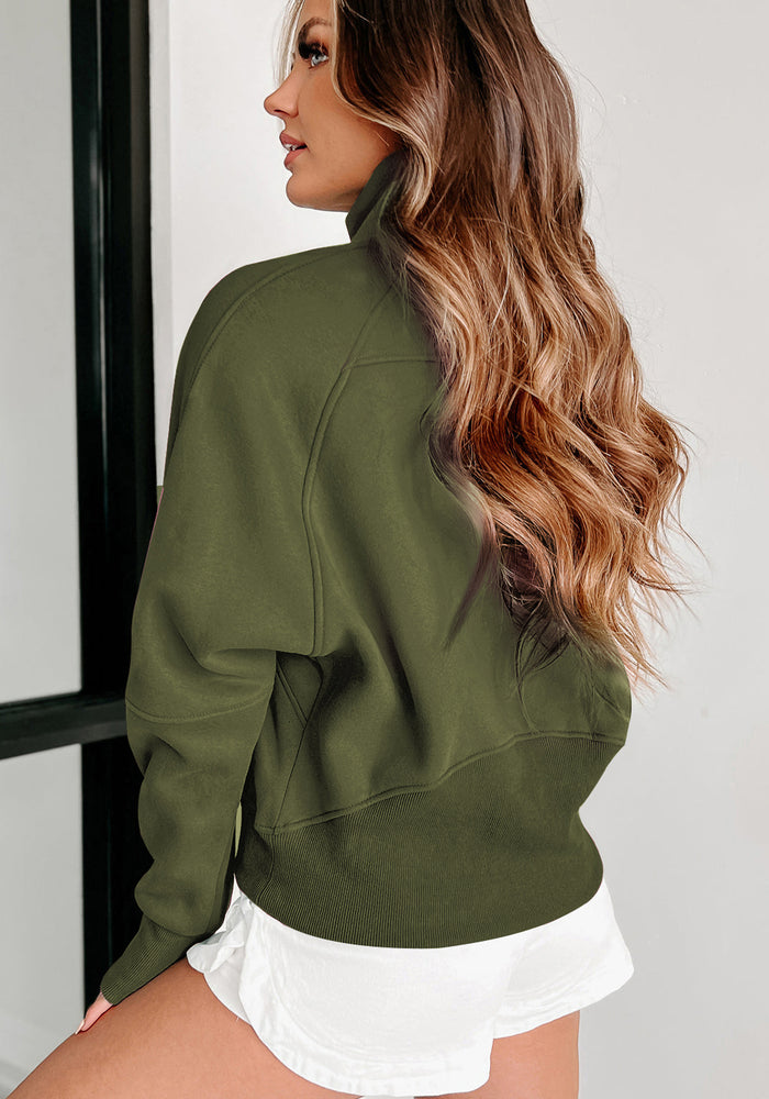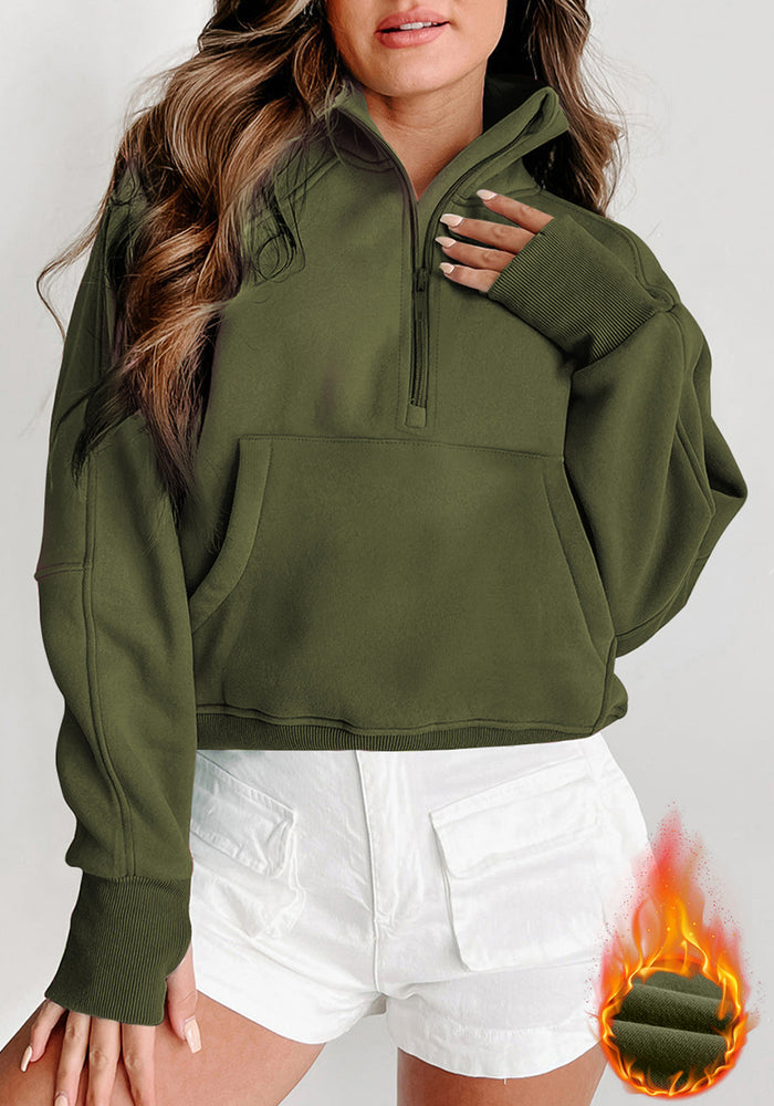 Green Fleece Lined Zip Up Stand Collar Thumbhole Sleeve Sweatshirt