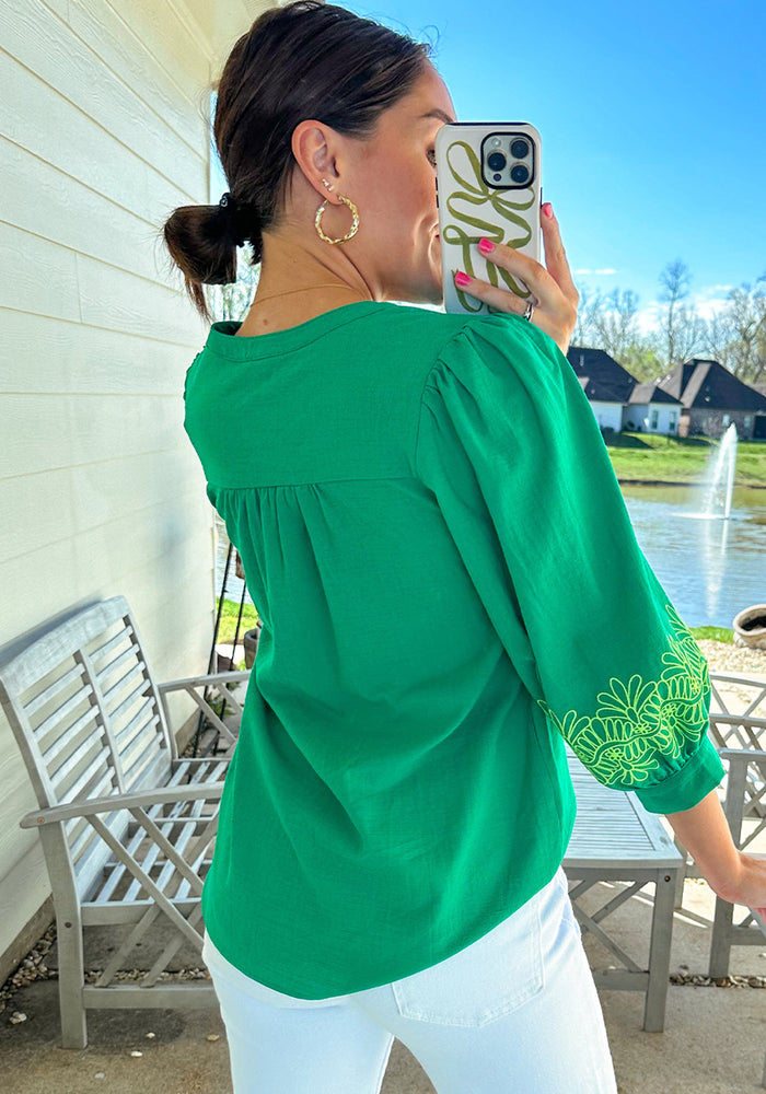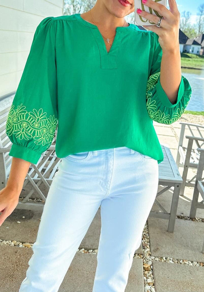 Green Contrast Floral Embroidered 3/4 Sleeve Notched V Neck Elegant Blouse