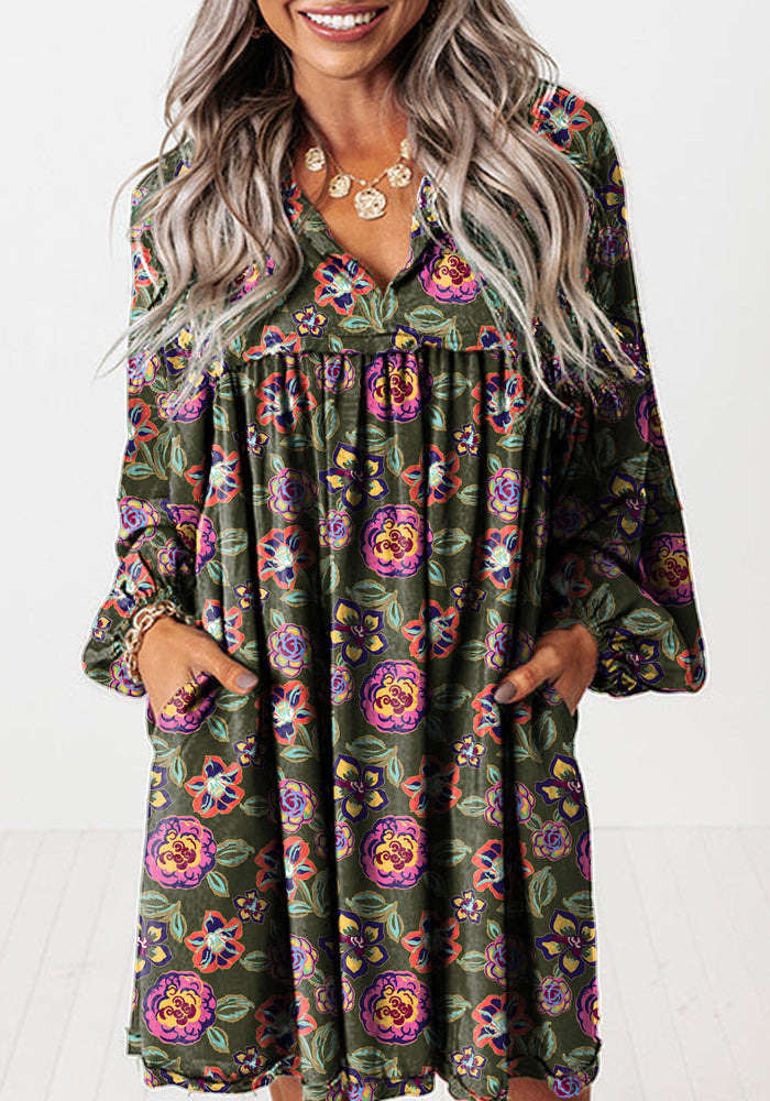 Green Floral Print Split Neck Bubble Sleeve Shift Mini Dress
