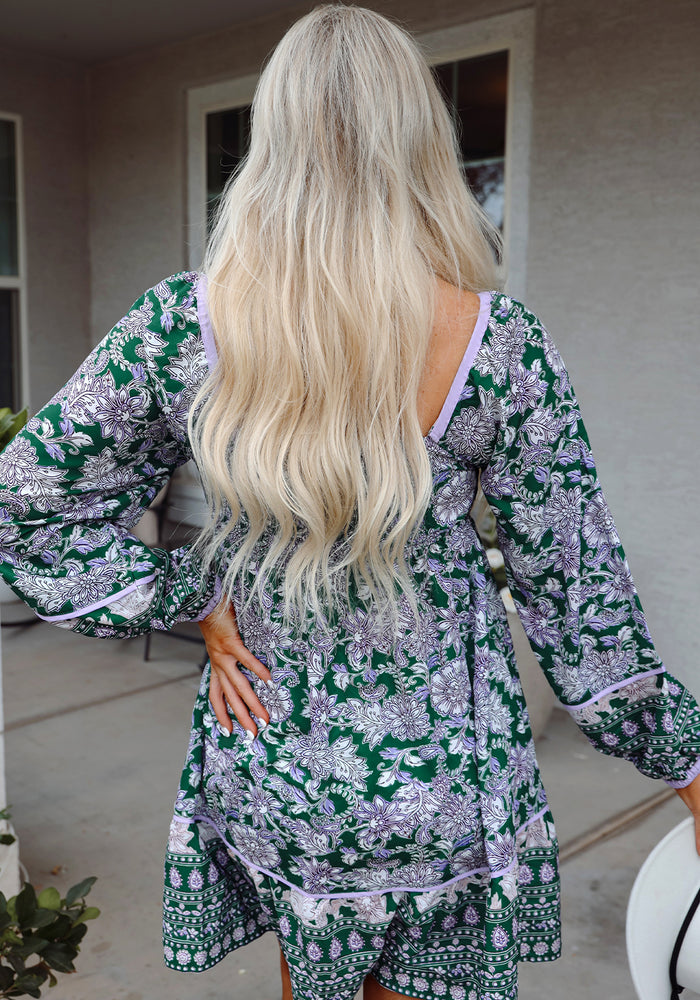 Green Floral Print Piping Trim Bubble Sleeve Square Neck Dress