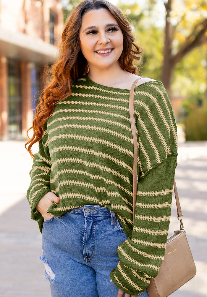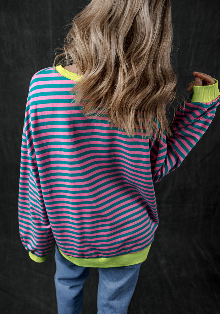 Green Stripe Oversized Contrast Trim Pullover Sweatshirt