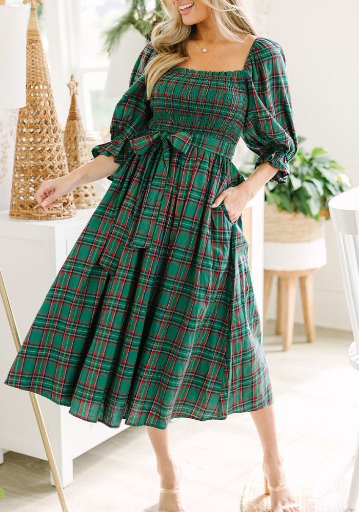 Green Tartan Plaid Square Neck Puff Sleeve Knot Waist Flared Midi Dress
