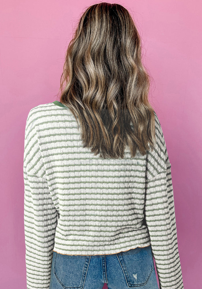 Green Stripe Textured Frilly Trim Buttons Henley Long Sleeve Top