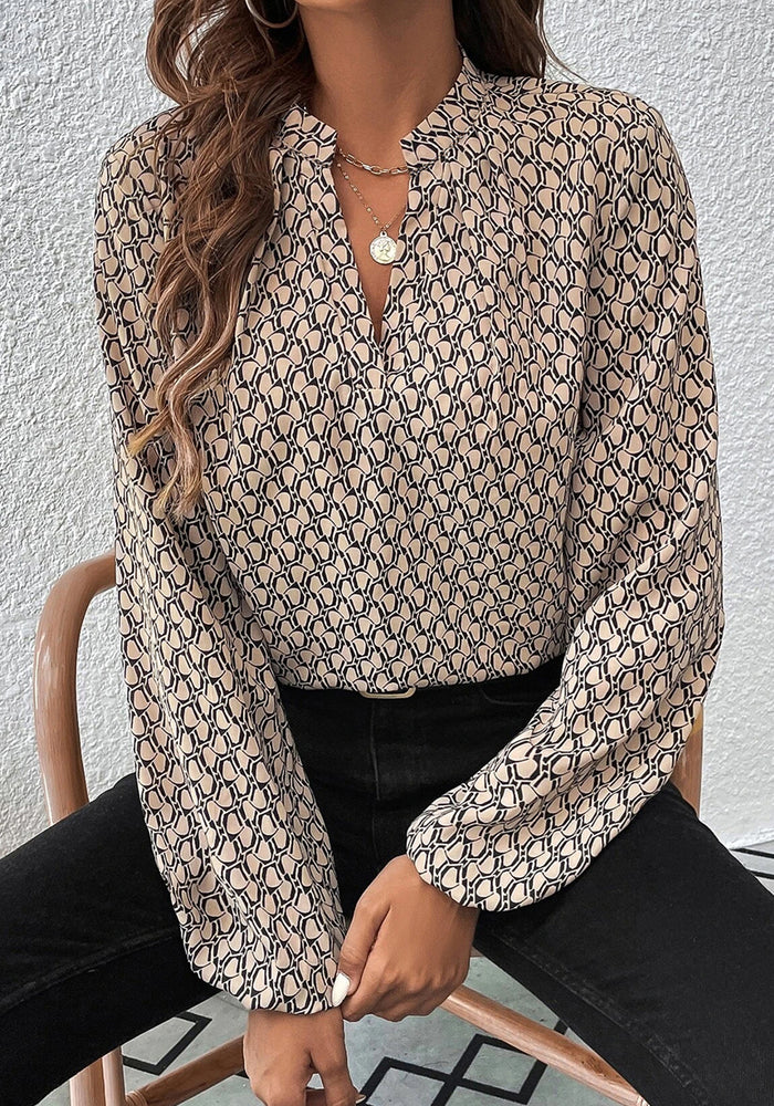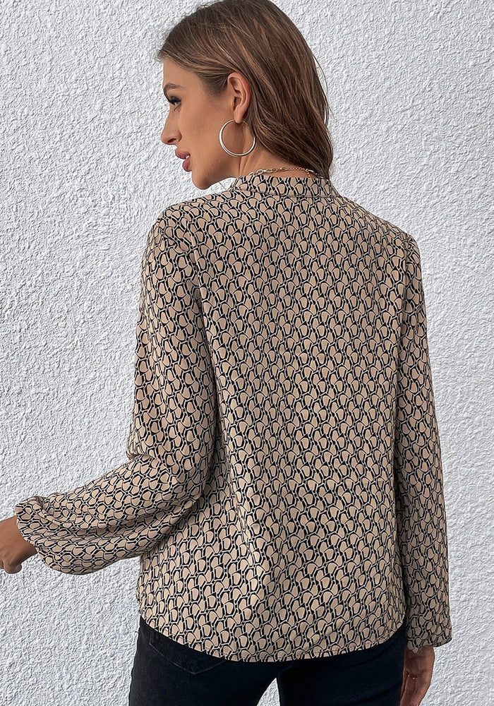 Khaki Geometric Print Notched Neck Puff Sleeve Blouse